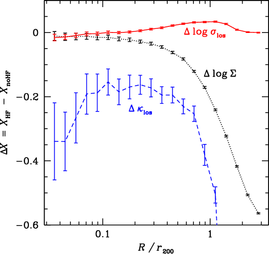 dimensions. The HF causes a shallower outer LOSVDP that cannot be