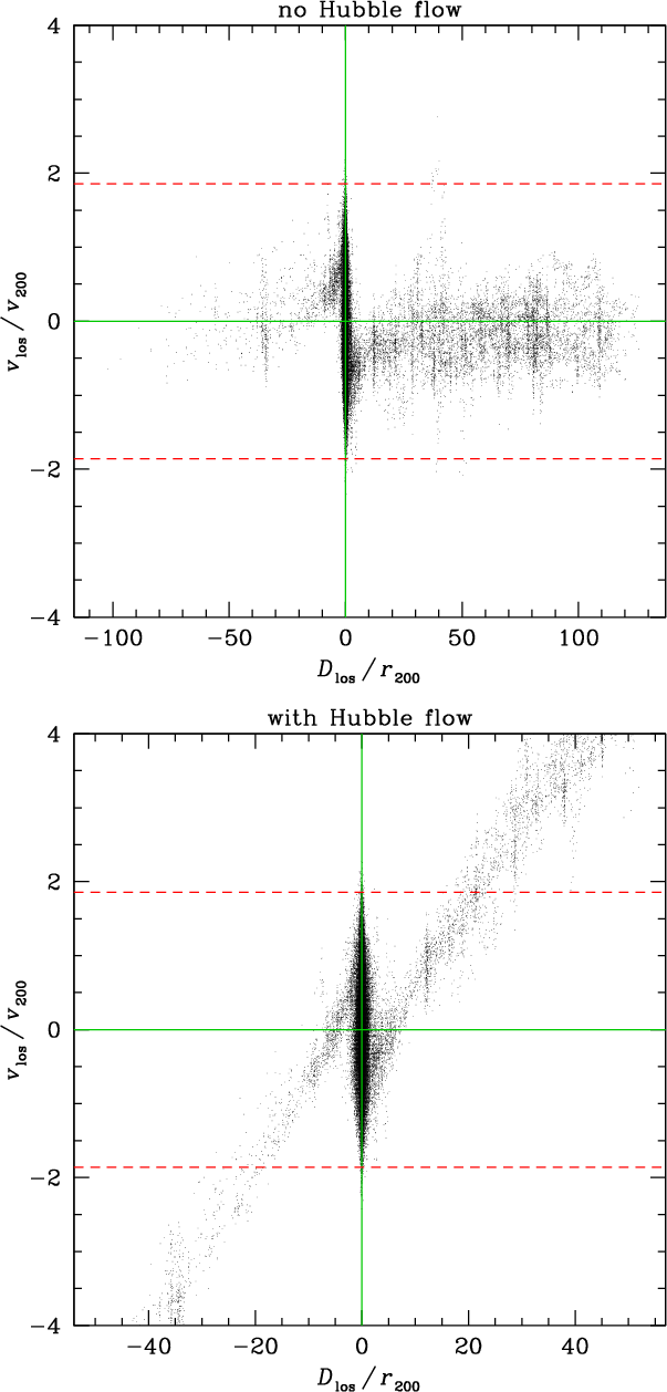 without (top) and with (bottom) the Hubble flow (1 particle in 5 is shown for clarity).