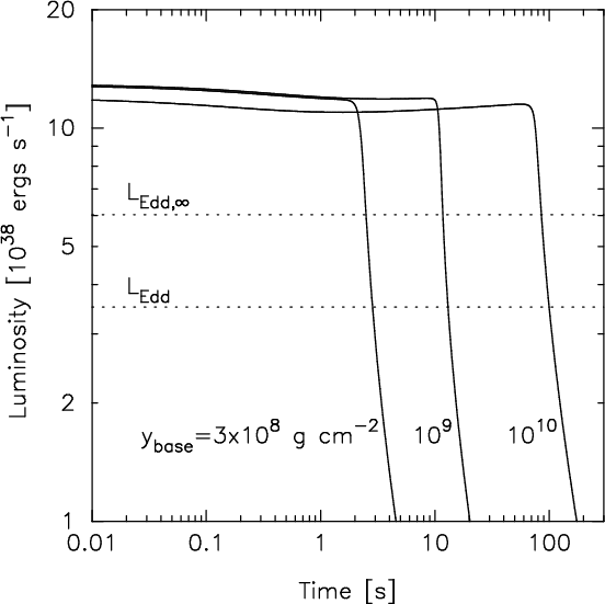 - During the burst rise, the flux first exceeds the Eddington limit at some depth deep below the photosphere. This is because the electron scattering opacity increases towards the surface due to the temperature-dependent Klein-Nishina corrections (Paczynski 1983). A given flux can therefore be sub-Eddington in the deeper layers and at a certain point become super-Eddington as it diffuses upward into lower density, cooler material.