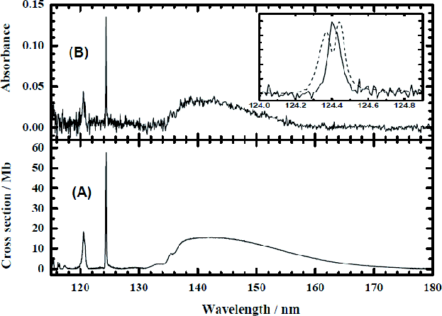 Figure 4: Absorption cross sections about 124.4 nm of O2 at 38 K (solid line) and 303.7 K (dashed line). |