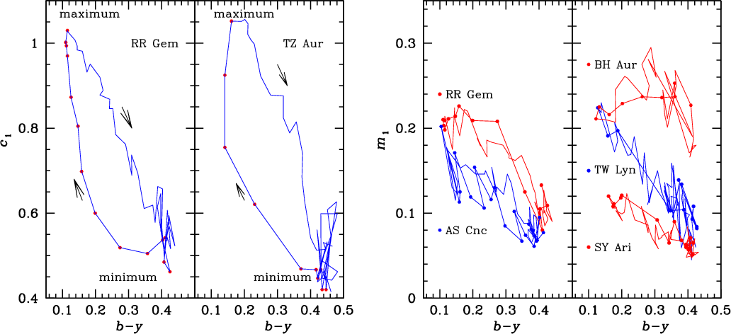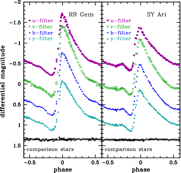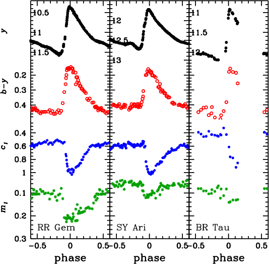 Figure 11: Three examples of Strömgren-photometry light curves of RR Lyrae stars near the possible ``bump'' in brightness. TW Lyn either does not show a bump or its bump is rather extended in phase; there is no or little effect on the colour indices. SY Ari does exhibit a bump in y but there are no effects in its colour indices. For AS Cnc, the colour indices u-b and u-v clearly change before y changes, indicating a change in the Balmer jump before a brightness change. The index b-y (representing temperature) changes somewhat later. |
