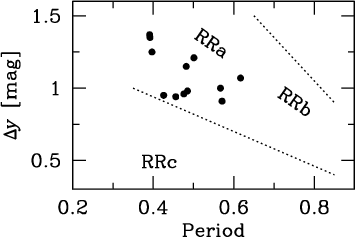 Figure 3: Plot of the amplitude in y versus period of our stars showing that they are fundamental mode RRa-type pulsators. The band between the dotted lines marks the zone of RRa and RRb pulsators (see Ledoux & Walraven 1958). |