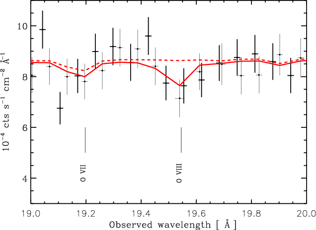 It can be seen from Fig. 1 that the source experienced strong variations in flux on a relatively short timescale, which is especially clear in the plotted 0.3-2 keV band, where we find a maximal variation in flux of about 20% between orbits 1087 and 1088. The source flux recovered during orbit 1089 so that its brightness was comparable to that of orbit 1087 by the end of the observation. For clarity, in what follows the 1087-, 1088-, and 1089-orbit, RGS datasets will be labeled as high (H), low (L), and recovering (R), respectively, according to their relative flux state.