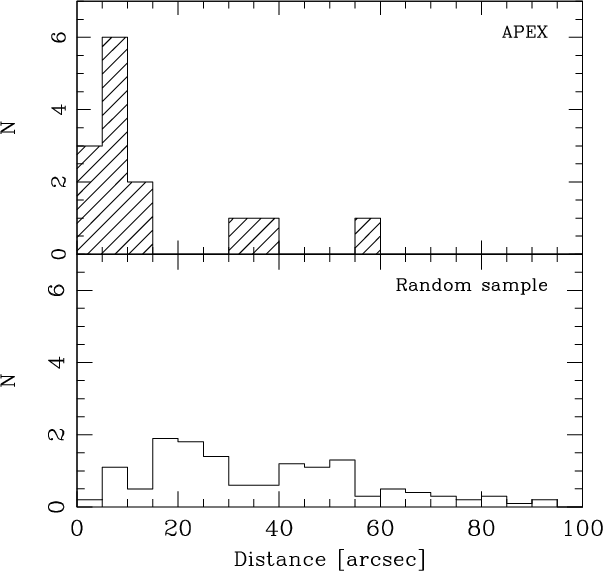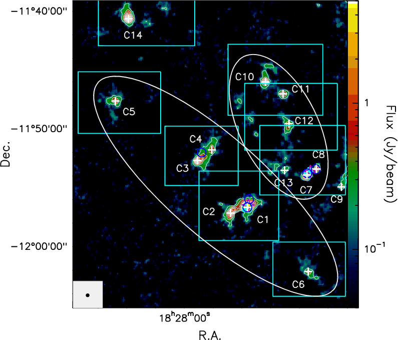 Table A.1: List of the sources in the sampled field, from the SIMBAD Astronomical Database. Columns (1)-(2): coordinates (J2000.0); Col. (3): distance from the peak emission of the associated clump (see Sect. 4.1); Col. (4): References.