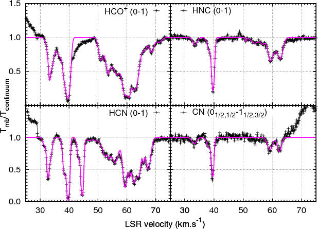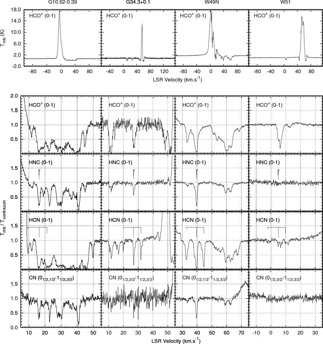 Figure 1: Absorption profiles observed in the direction of G10.62-0.39, G34.3+0.1, W49N, and W51 in the ground state transitions of HCO+, HCN, HNC, and CN. The hyperfine structure (relative positions and relative LTE line strength) of the J=0-1 transition of HNC and HCN are displayed. The broad velocity coverage of the upper panels illustrates the quality of the baseline and the complexity of the emission and absorption mixture. The lower panels display the velocity structure of the absorption features in more details. All the spectra of the lower panels have been normalized to the continuum temperature. |