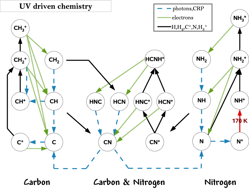 - In a UV-dominated chemistry, the main destruction route of NH3 is its photodissociation. The product NH2 then leads to the formation of NH and CN (see Fig. C.1).
