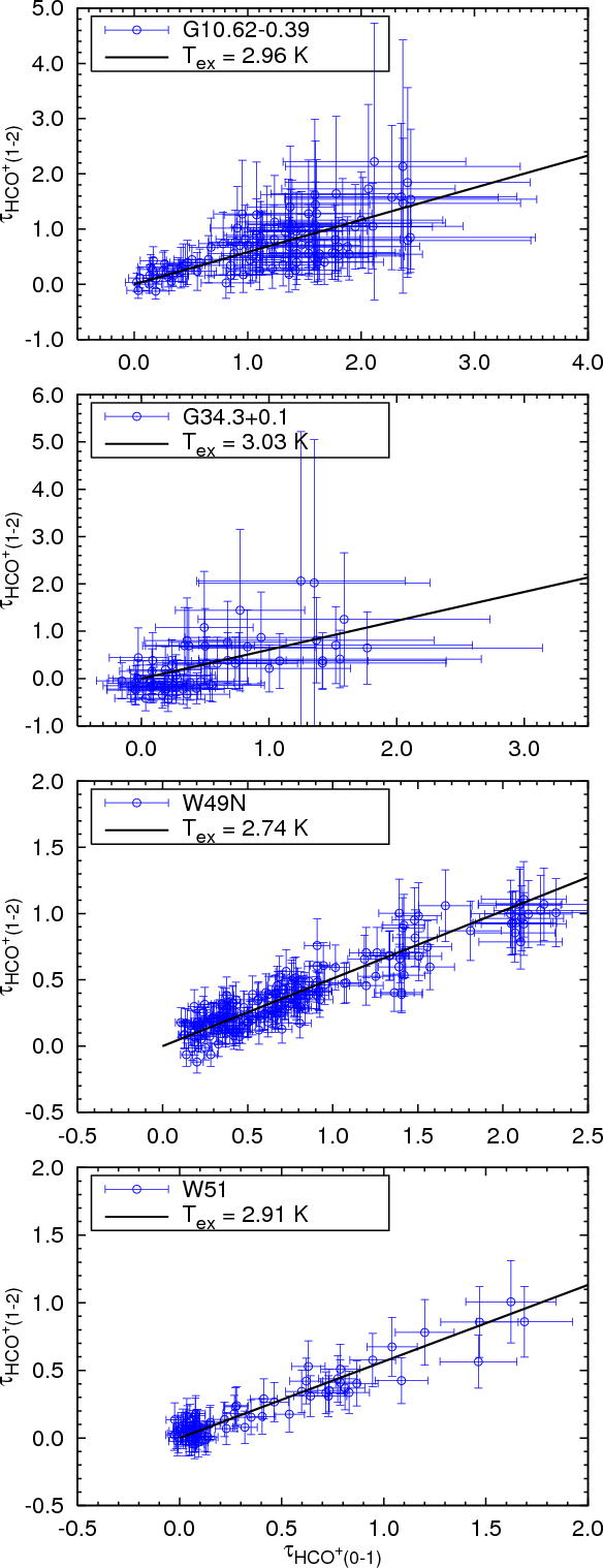 and decreases from 0.04 to 0.01 km s-1 as the true linewidth increases from 0.3 to 3.4 km s-1. These uncertainties are smaller than (or comparable to) those inferred from the fitting procedure and the resulting errors on the column densities are at most 12%. In comparison the resulting errors on central opacities and velocity centroids are negligible.