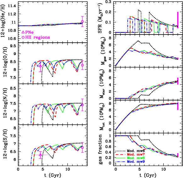 Therefore, the large amount of information available for Local Group (LG) dwarf galaxies, such as star formation rate (SFR), H I and H2 contents, star surface density, and metallicity distribution, allows us to use them to test chemical evolution models of different kind of galaxies (cf. Carigi et al. 2002; Lanfranchi & Matteucci 2003; Mollá & Díaz 2005). Elemental abundance ratios and their variation over cosmic time because of ongoing star formation (SF) are among the most important constraints of chemical evolution models (e.g., Mollá et al. 1996). In this framework, optical spectroscopy of emission-line gas in galaxies is essential for deriving chemical abundances. In particular, H II regions and planetary nebulae (PNe) provide information about the gas chemical composition at two different epochs in the galactic history: H II regions provide the present time chemical abundances, while PNe probe the distant past chemistry.
