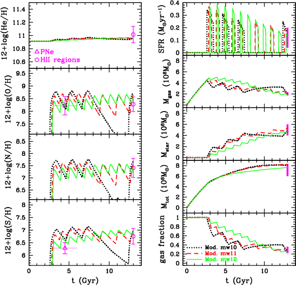 - We exclude evolution without galactic winds. In this case, our model can reproduce neither the present-time gas fraction nor the metallicity of IC 10 at the same time without including winds. Therefore, galactic winds must occur.