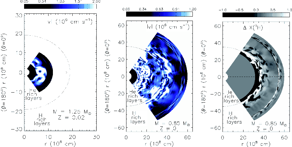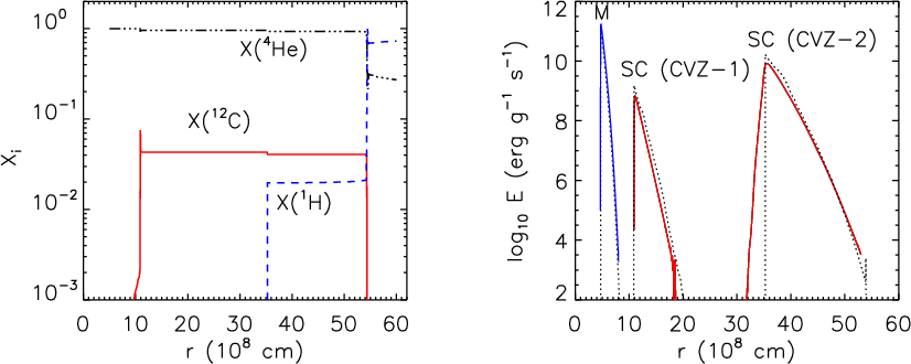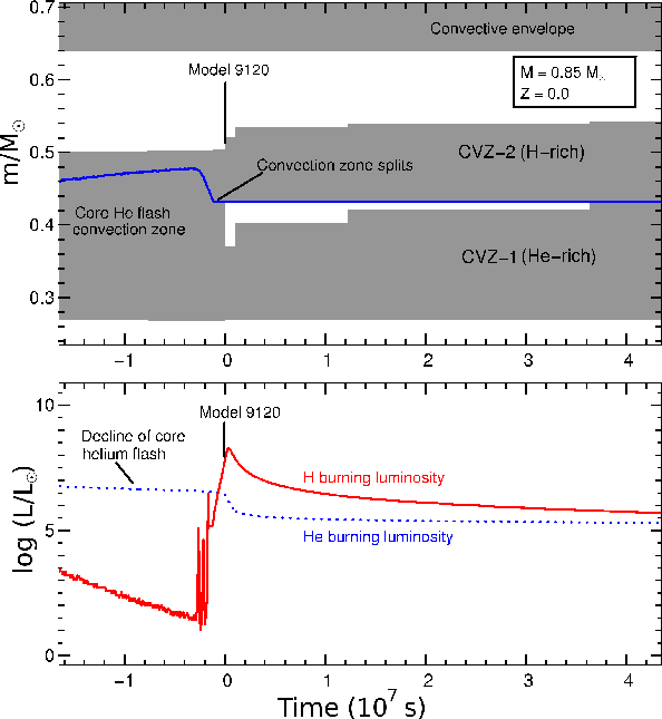 - The depth of the inner convection zone sustained by helium burning CVZ-1 is approximately 4 pressure scale heights (Hp), whereas the depth of CVZ-2, sustained by the CNO cycle, is roughly 3 Hp