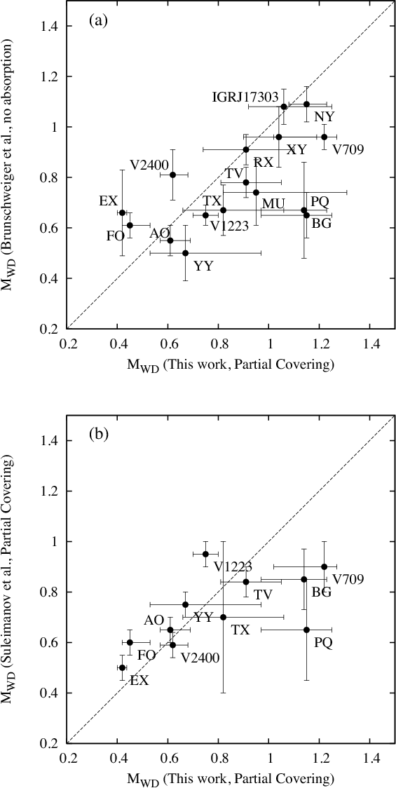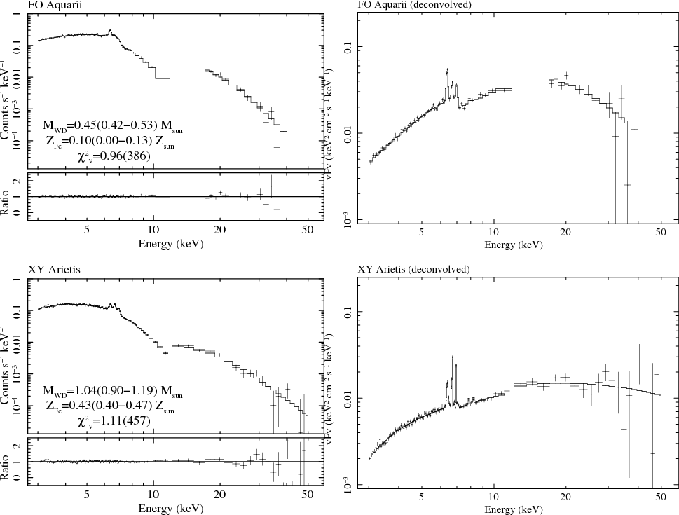 The X-ray spectroscopic approach is in practice subdivided into two methods, the continuum method and the emission line method. The former requires a sensitive hard X-ray detector since the relevant spectral feature, namely exponential cutoff which reflects the shock temperature, appears in the hard X-ray range (energy >10 keV). The latter relies on the resolved emission lines (e.g. from Fe), hence requiring a detector with a relatively high energy resolution such as an X-ray CCD (charge coupled device) camera. The continuum method has been applied to the data taken with Ginga (Ishida 1991; Cropper et al. 1998), RXTE (Suleimanov et al. 2008,2005; Ramsay 2000), and Swift (Landi et al. 2009; Brunschweiger et al. 2009). Fujimoto & Ishida (1997) and Ezuka & Ishida (1999) applied the emission line method to the ASCA data, deriving the metal abundances as well.