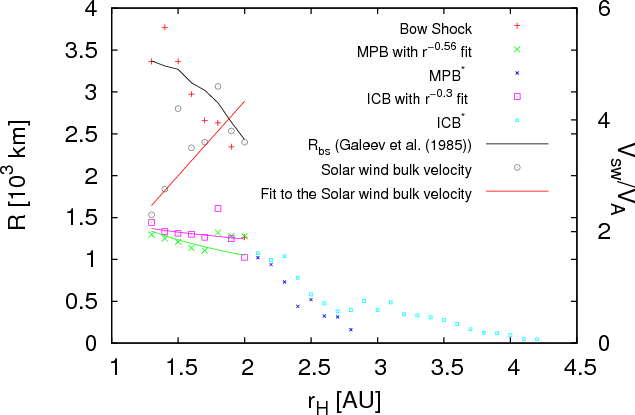 In Fig. 3 we also display the bow shock strength in terms of the Mach number as function of heliocentric distance. One can see that the hybrid model predicts a BS with a Mach number of about 2.3 for comet CG. As the comet approaches its perihelion position, the Mach number of the solar wind flow drops very steeply to this value.