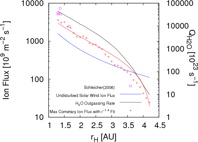 Figure 1: Left scale: maximum of the cometary ion flux as a function of heliocentric distance. The maximum is taken from the whole simulation domain and fitted with a rational law r-1.4. For comparison the undisturbed solar wind ion flux is also shown. Three regimes can be distinguished. At the beginning, the solar-wind ion flux exceeds the cometary ion flux, this is the test-particle regime that covers the range from 4.2 AU to 3.7 AU. Around 3.7 AU, these quantities reach the same values. This regime is referred to as the Mach cone regime, which covers the range up to 2.7 AU. From 2.7 AU to 1.3 AU, the maximum cometary ion flux clealry exceeds the solar wind ion flux. This is the shock formation regime. Right scale: total water outgassing rates. |