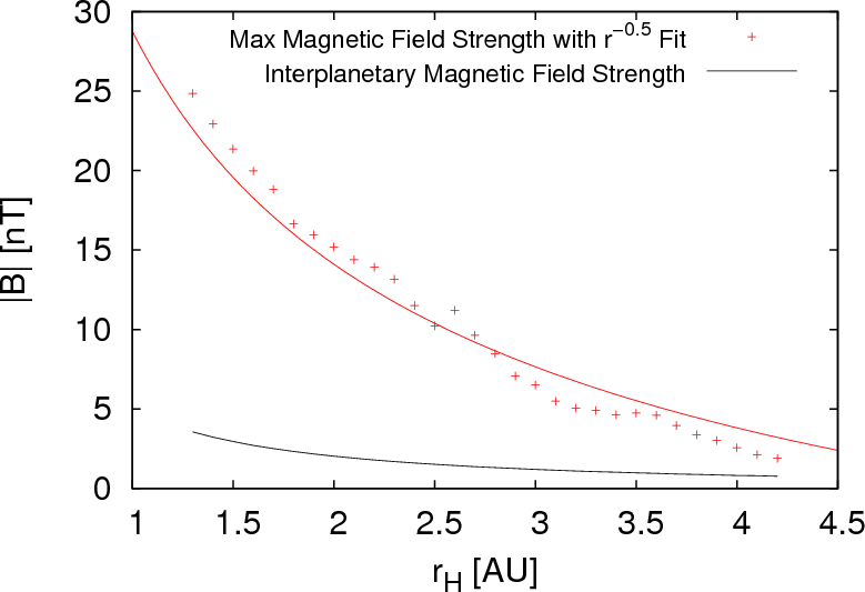 the comet approaches the Sun the magnetic field maximum exceeds the