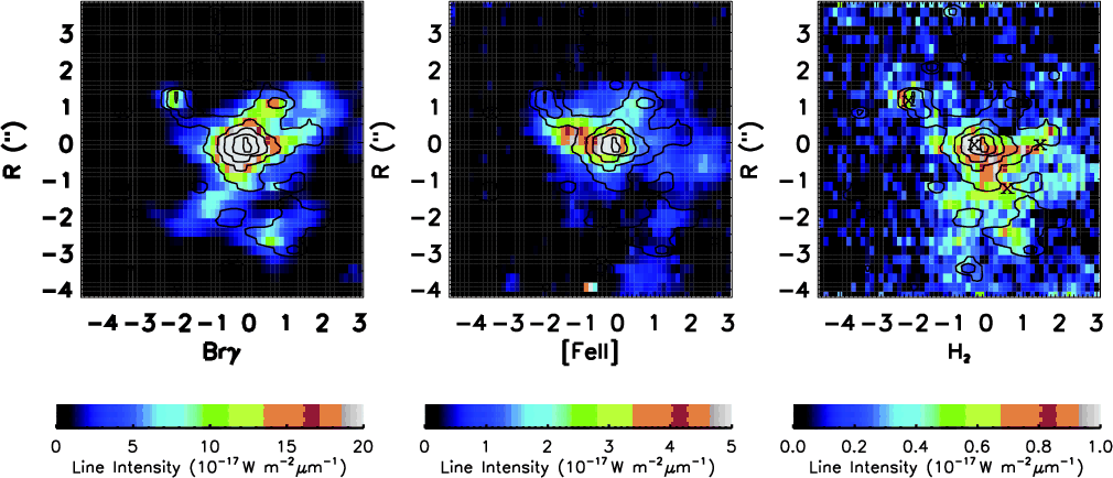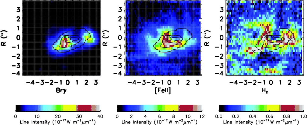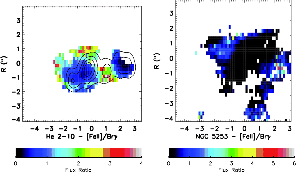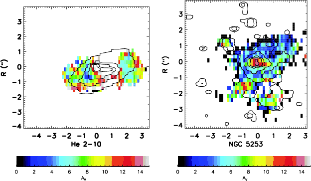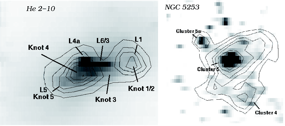 K-band continuum images of He 2-10 (left panel) and NGC 5253 (right panel), extracted from the SINFONI datacube. The Br |