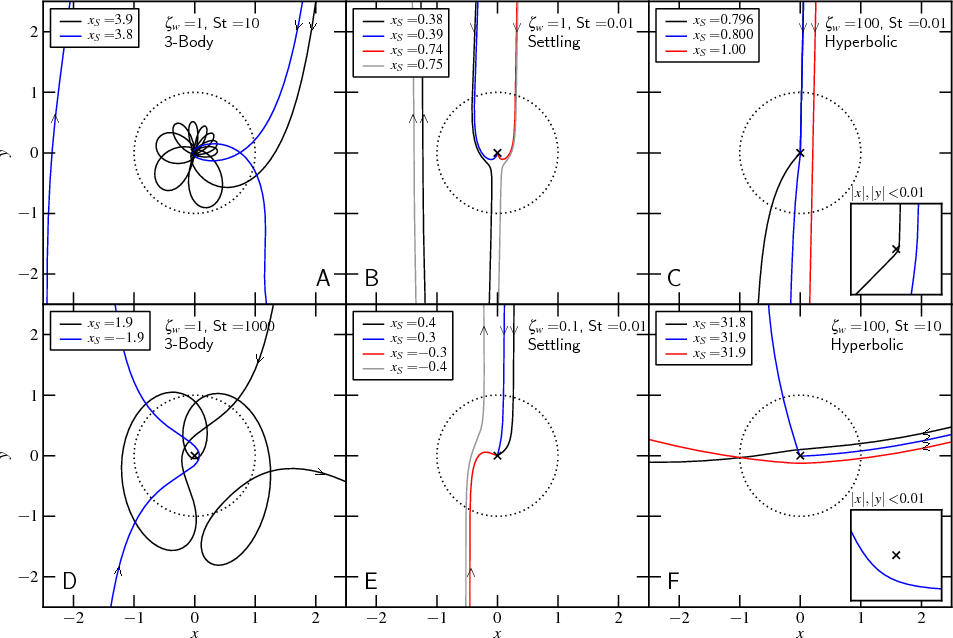 distinguished: hyperbolic encounters, where the 2-body gravitational focusing enhances the impact parameter; three-body encounters, where gas drag enhances the capture probability; and settling encounters,