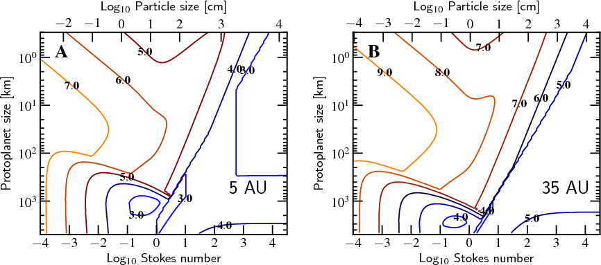 distance of 5 AU. Accretion of debris on small protoplanets (
