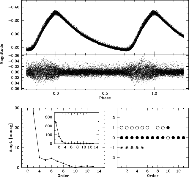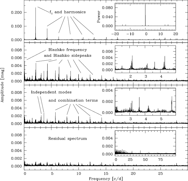 have been identified as the main frequency f0 and its harmonics, two independent terms, the terms related to the Blazhko frequency fm, and to several combination terms.
