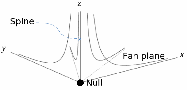 | Figure 1: The configuration at the 3D null point showing typical fieldlines, the null point, the spine (coinciding with the z axis in the coordinate system used here) and the fan (coinciding with the xy plane). |