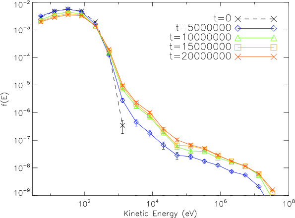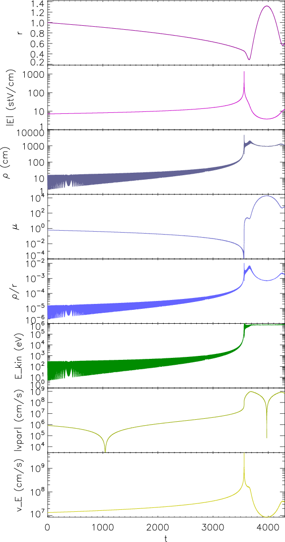 to their final energies. The case shown has reduced electric field magnitude (by a factor of 1/5) compared with standard