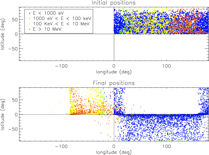 Fig. 7, which shows the injection and final positions of particles, colour-coded according
