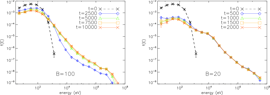 The number of particles accelerated increases as the electric field strength increases, and decreases with increasing magnetic field strength. The maximum energy attainable increases as the electric field strength is increased. However, the dependence of the shape of the energy spectrum on the electric and magnetic fields is quite complex, and the spectra cannot be simply defined by a single power law index.