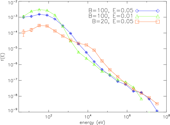 Figure 6: The effects of varying electric and magnetic field magnitudes on the steady-state energy spectra. |