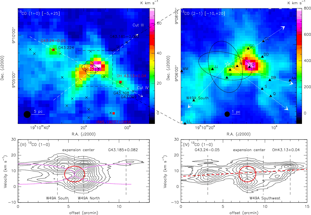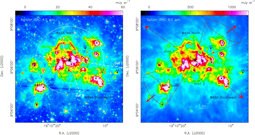 seen in the GLIMPSE images. The expanding shells in W49A are suggestive