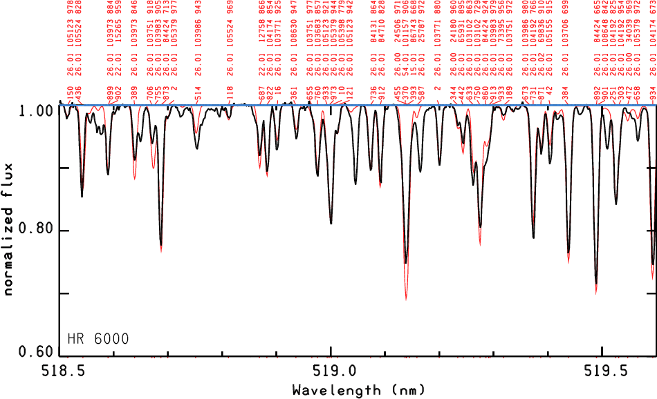 Figure 2: Comparison of the UVES spectrum of HR 6000 (black line) with a synthetic spectrum (red line) computed with a line list including the new Fe II lines. The line identification can be decoded as follows: for the first line, 150 last 3 digits of wavelength 518.5150 nm; 26 atomic number of iron; .01 charge/100, i.e. 26.01 identifies the line as Fe II; 105 123 is the energy of the lower level in cm-1; 970 is the residual central intensity in per mil. |