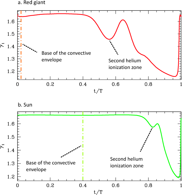 In summary, we have shown that the acoustic pulsation modes detected by CoRoT in the red giant star HR 7349 bear the signature of a sharp-structure variation inside the star. Comparison with stellar models allows us to interpret this feature as caused by a local depression of the sound speed occurring in the helium second-ionization region.| Figure 5: