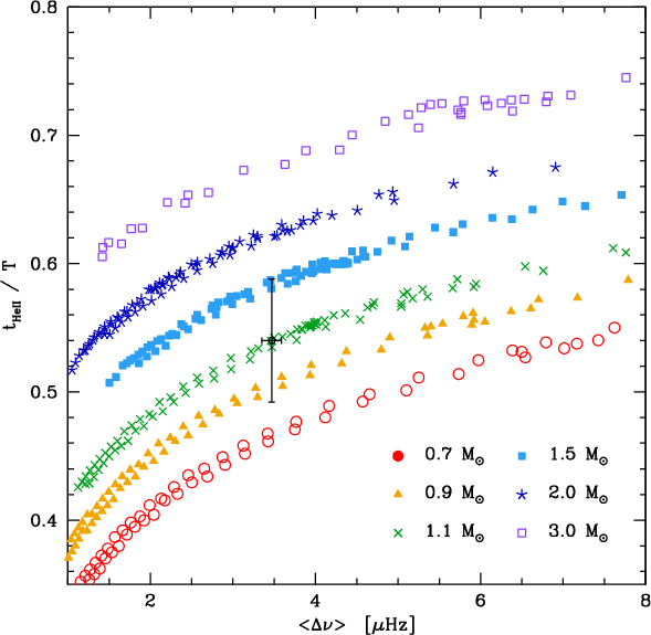 We finally recall that the detectability of the signature of He ionization can potentially lead us to a seismic estimate of the envelope helium abundance in old stars. Indeed, as shown for the Sun and solar-like stars, the amplitude of the periodic component depends on the envelope helium abundance (see e.g. Basu et al. 2004; Houdek & Gough 2007, and references therein). While CoRoT and Kepler observations will provide other targets and further reduce the uncertainty on the oscillation frequencies, a thorough study on the required precision in terms of seismic and non-seismic observational constraints, as well as and in terms of models, should be undertaken to aim for reliable seismic estimate of the envelope helium abundance in giants.