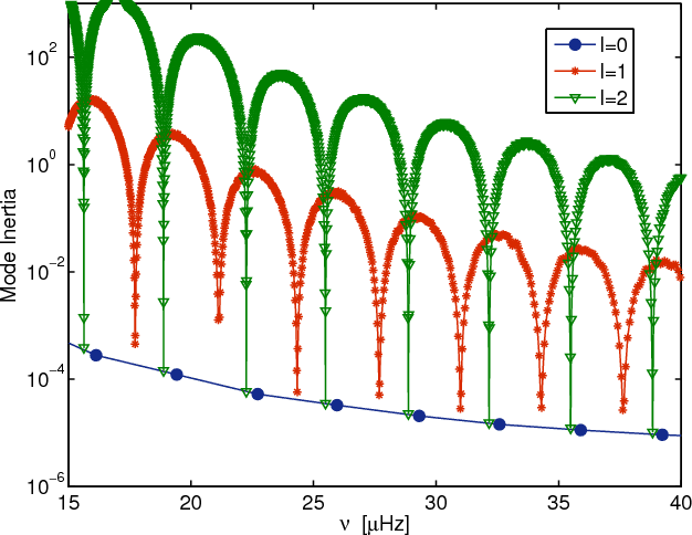 Mode inertias of radial modes (full dots), |
