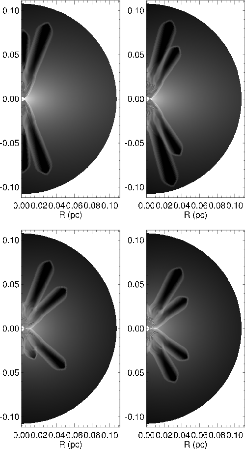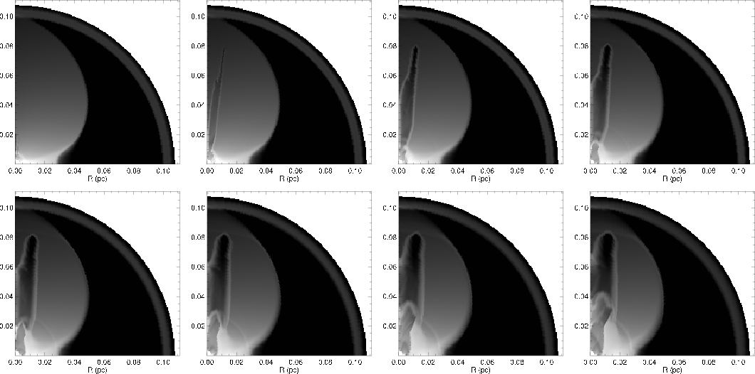 The last snapshot in Fig. 1 (at 8000 yr) shows the final development of our model. At 0.02 pc, a high-density blob produced by the convergence of two oblique shocks defines the position of the dissociation front at the polar axis. Above this blob, the remnant lobes collimate the expansion of the molecular flow beyond the dissociation front. At 0.045 pc, the molecular outflow reaches values of 8.7 km s-1 .