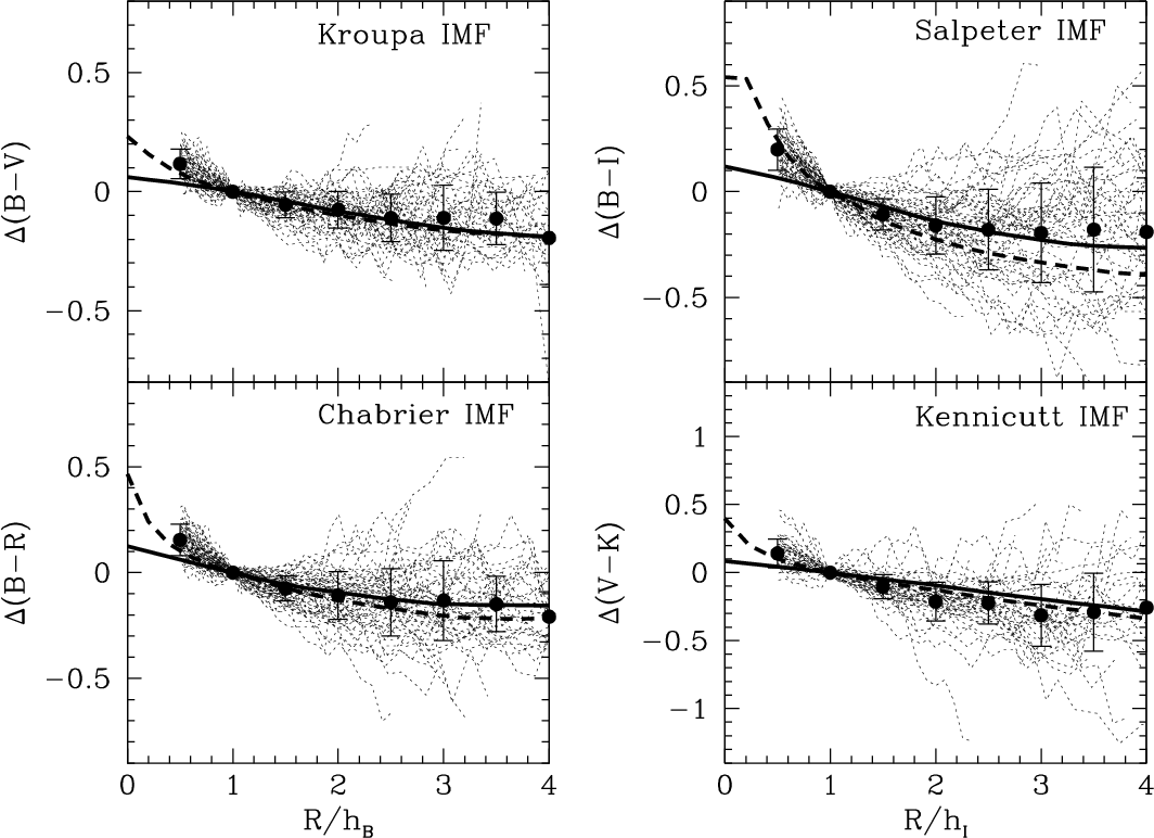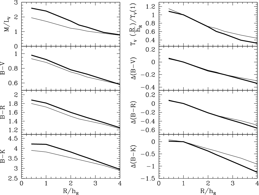 - The Bell & de Jong (2001) models are detailed multi-zone models accounting for the observed gradients in colour, metallicity, and age of galactic discs; however, the colour-M/L relations they present refer to their global galaxy models. Though similar relations have been shown to also hold radially, within individual discs (PST04) it is not a priori guaranteed that the same relations hold globally and locally, especially for NIR bands where the age-metallicity degeneracy is lifted. This caveat applies in particular to the (much shallower) semi-empirical relations of Bell et al. (2003), which are the result of simple one-zone models calibrated on the global photometric properties of a large sample of SDSS/2MASS galaxies.