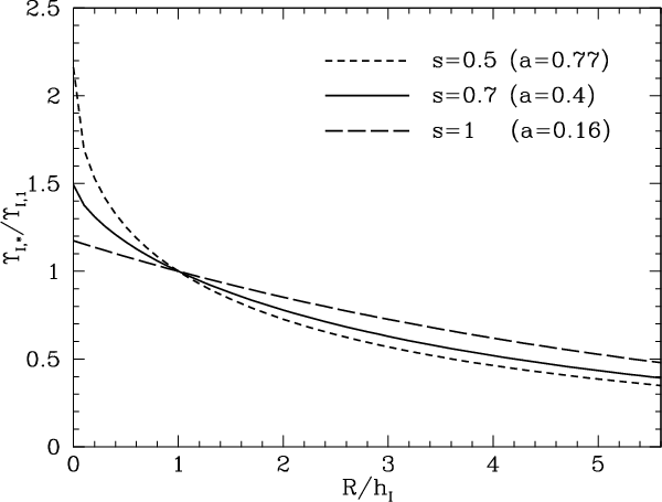 where I(R) is either directly the observed surface brightness or its exponential fit. Equation (1b) corresponds to the simplest assumption according to which the stellar mass strictly follows the light. This is reasonable, especially when the surface brightness is measured in the red or infrared bands that best trace the stellar mass distribution, in view of the approximate radial constancy of galaxy colours (e.g. Kent 1986; Verheijen 1997). On the other hand, various observational facts suggest that different regions in a spiral galaxy experience different evolutionary histories that lead to different colours and mass-to-light ratios. Then, it is worth dropping the assumption of a constant