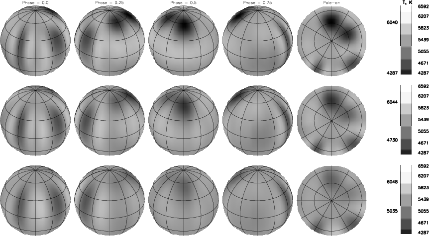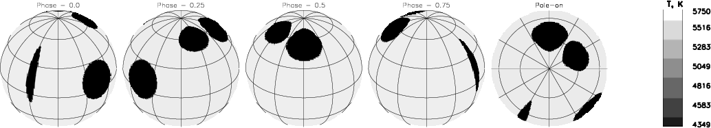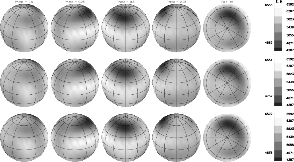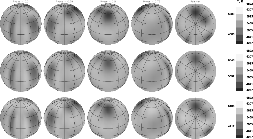 The resulting surface temperature map of V889 Her obtained with the Occamian approach with LSD is shown in Fig. 17 and, for comparison, the map obtained without LSD from the same data is shown in Fig. 18. As seen from the maps, the temperature range is smaller for the case with LSD than without it. However, the spot occupancy does not change dramatically. The polar spot recovered with LSD is more compact than the one recovered without LSD and is comparable with the one by Jeffers & Donati (2008) obtained from data taken only about a month earlier.