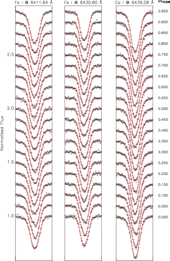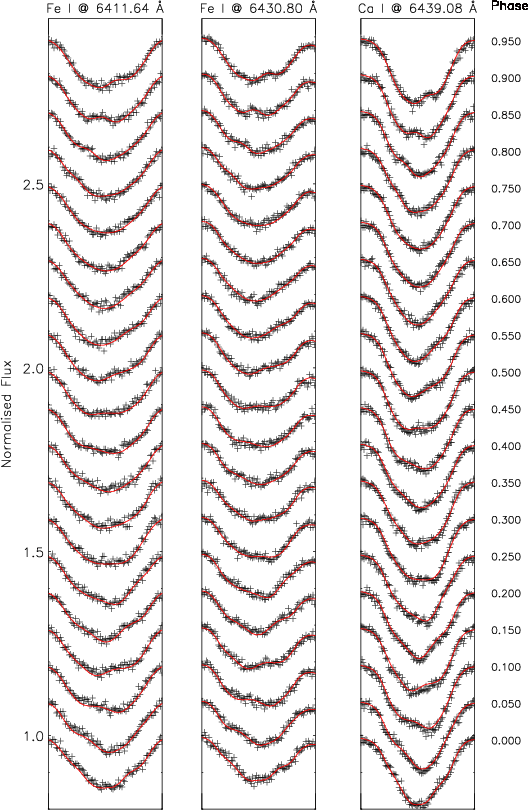 Calculated (red lines) and observed (crosses) LSD profiles for