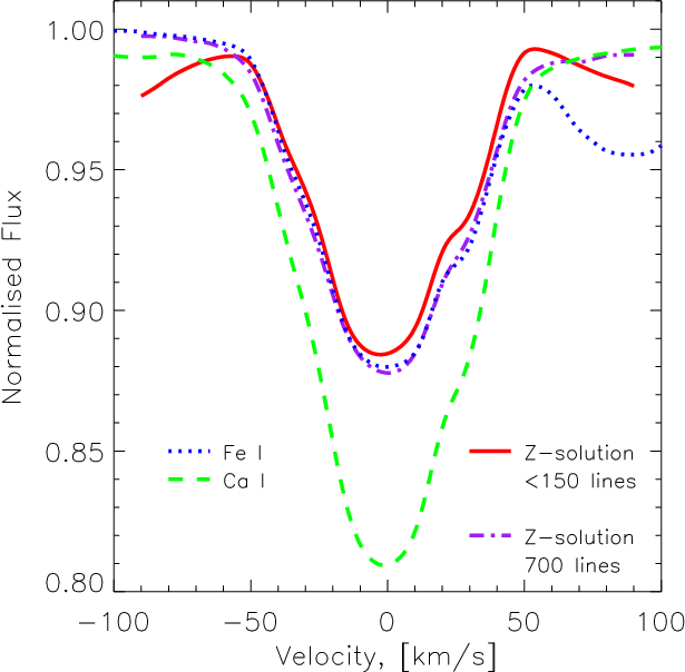 Figure 11: Two example Z-profiles using 148 lines (solid red line) and 700 lines (dash-dot purple line) are plotted for comparison with Fe I 6430.80 Å (dotted blue line) and Ca I 6439.08 Å (dashed green line). The stellar rotation velocity is 45 km s-1 and S/N is infinite. |