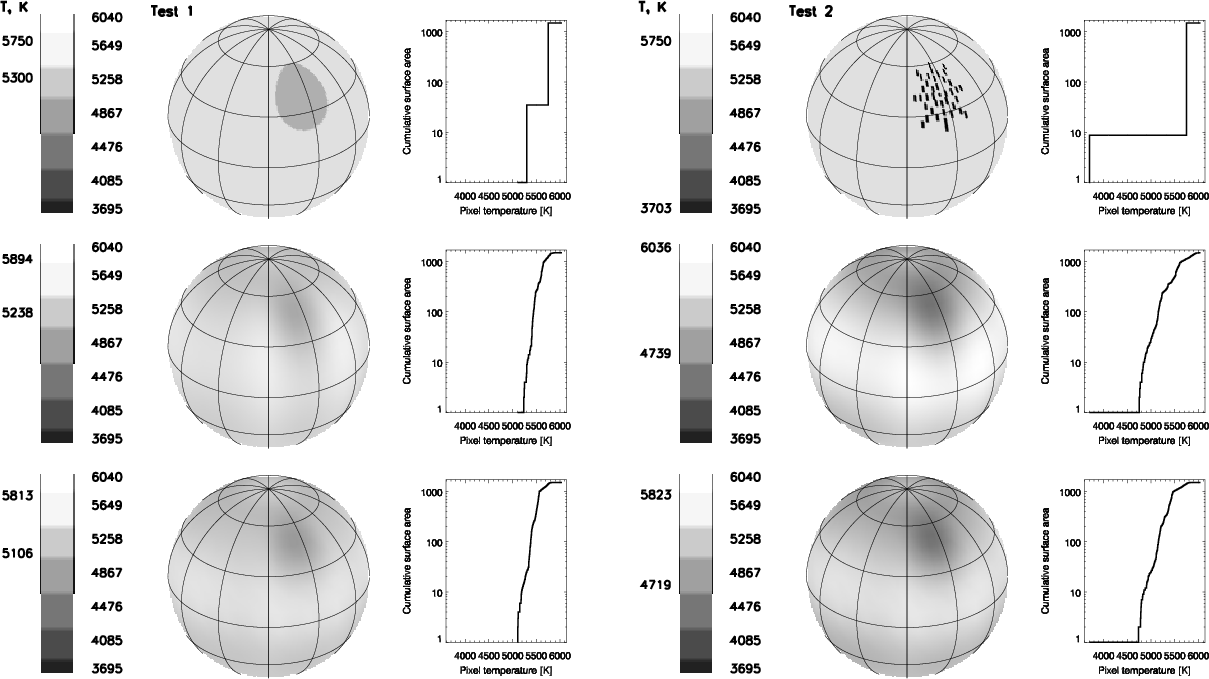 In both test cases, the overall spot location is again well recovered. However, as expected, the obtained temperature distribution is not perfect. The differentiation in latitude is poor in equatorial regions. Therefore, the features are more smeared towards the equator, and only the strongest features are properly recovered. This is an old problem and is discussed in many papers (see, for example, Rice et al. 1989 or Rice 2002). The case with a warm solid spot shows that its contrast is smoothed: the middle area of the spot is somewhat cooler than the given input temperature, while the rim of the spot is too warm. However, the cumulative surface area versus temperature plot demonstrates that the solution approximates the input well for both DI with and without LSD. The recovered images for the case with unresolved, small, cool spots show a blurred spot centred at the spot group, as expected for low spatial resolution data. The temperature scale and cumulative surface area plot show that we do not reach the input spot temperature. Nevertheless, the recovered spot is clearly cooler than in in the first test, but without knowing the difference between the two inputs it is impossible to decide whether we resolve real spots.