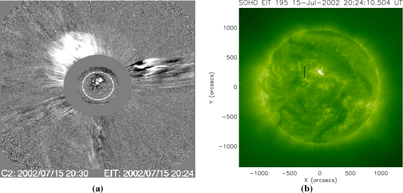 Figure 1: a) Difference image showing the halo CME observed by LASCO-C2 on 2002 july 15 at 20:30:05 UT, superposed on the EIT difference image relevant to 20:24 UT; b) SOHO/EIT full disk image acquired on 2002 july 15 at 20:24:10 UT, showing the location on the disk of the CME source region. |