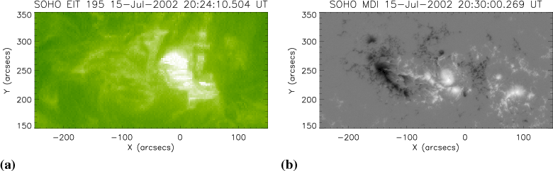 | Figure 2: a) Zoom of the active region NOAA 10030 where the CME was initiated; the image was acquired by SOHO/EIT during the main phase of the flare; b) MDI/SOHO magnetogram showing the magnetic configuration of NOAA 10030 on 15 July 2002. |