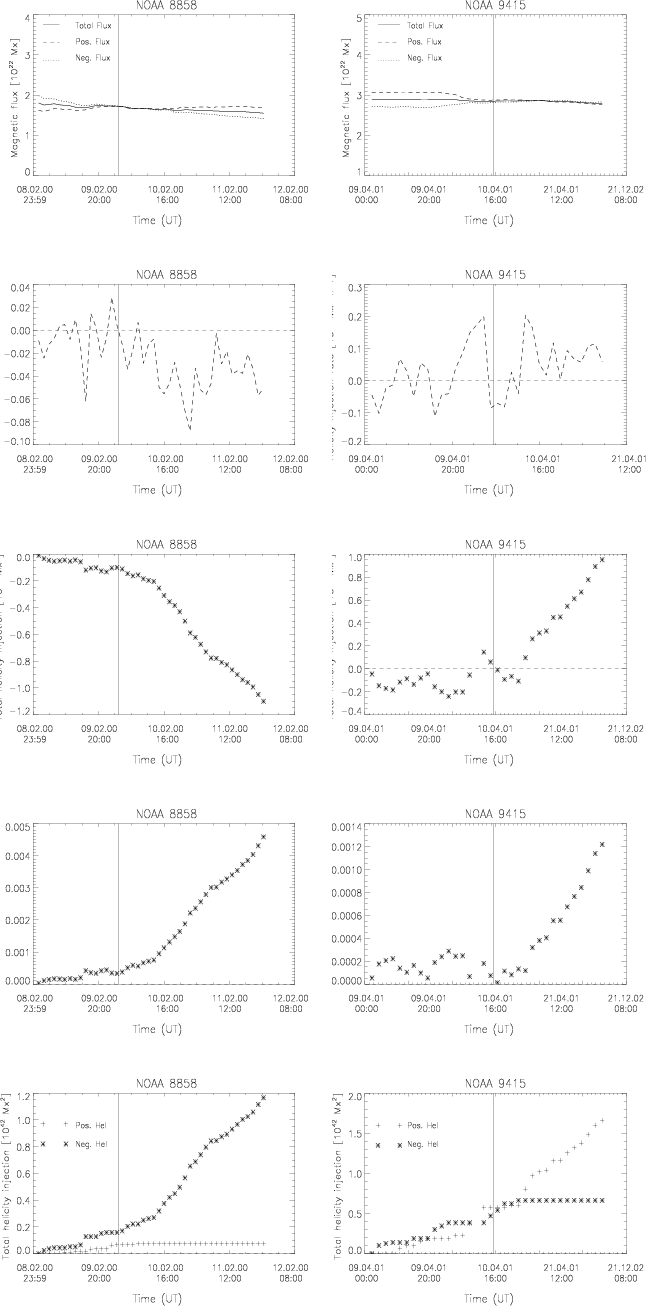 On the basis of these results it is clear that the study of the magnetic helicity evolution in active regions can provide a useful tool to obtain important information about the mechanisms able to produce instabilities in the magnetic configuration. Moreover, the investigation of the magnetic helicity trend, before and after a CME occurrence, might contribute to our understanding of the role effectively played by these events in any eventual change in the magnetic helicity accumulation process (see, e.g., Nindos et al. 2003).