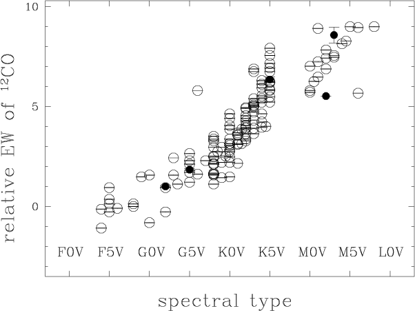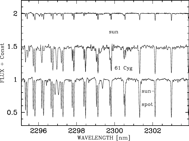 Figure 5: Spectra of the Sun (G2V), 61 Cyg B (K7V), and a sunspot (M3V), demonstrating the increase in the strength of the CO-lines towards later spectral types. |