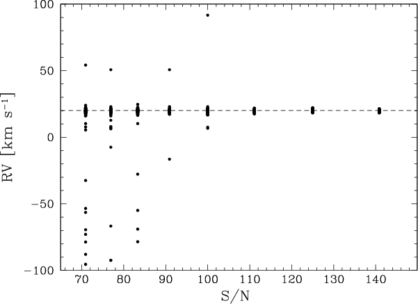 Giant stars in the field would certainly be much brighter in the IR than in the optical regime. As shown in Deleuil et al. (2009), about 70% of the giant stars in the CoRoT fields are K-stars, the remainder being G-type giants. Without extinction, the V-K colours are in the range between 2.3 and 3.6 mag for K-giants, and 1.8 and 2.2 mag for G-giants, respectively. If we take into account that the surveys are carried out close to the plane of the Milky Way, the extinction will make these objects even redder. Brown (2009) finds that the J-K colours of background giant stars are between 0.5 and 1.5 mag. Background giants are thus at least two mag brighter in the K-band than in the optical regime. Thus, acquiring IR spectra can greatly increase our likelihood of detecting background giants. This is especially true for K-giants, since K-stars have strong CO-line overtone lines.