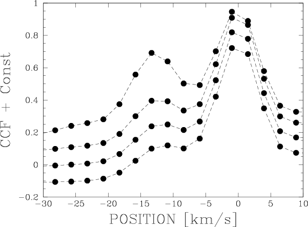 Figure 6: Cross-correlation function for a solar-like star and an M-star companion which is 3, 4, 4.5 and 5.0 mag fainter. |
