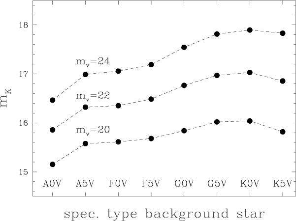 Figure 7: Brightness of an unrelated main-sequence background star with mV=20,22, and 24 in the K-band. Because the extinction is smaller in the IR, the objects are much brighter in this wavelength regime. |