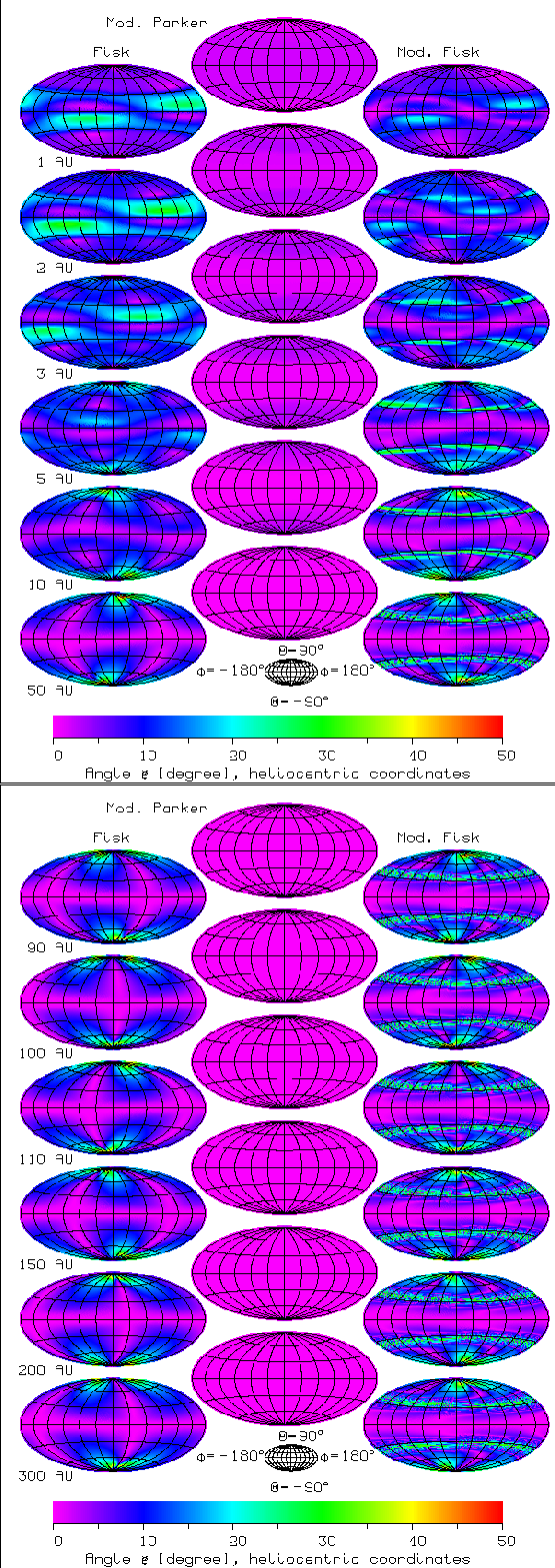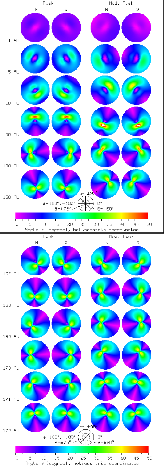 - For all fields discussed here, the efficiency of injection of PUIs into the Fermi-I acceleration process at the termination shock is expected to be essentially the same, because the deviations in the different tilt angles at the termination shock are only visible in a fine structure, which is most probably not accessible to observations. The only distinct features are relatively narrow bands of strong tilt angle variations occurring for the modified Fisk field in the transition region from a slow to a fast wind.