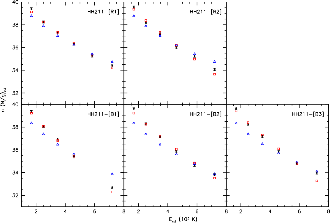 Conclusions. Spitzer spectral mapping observations reveal for the first time a cool H2 component towards the CO jet of HH211 consistent with the CO material being fully molecular and warm at