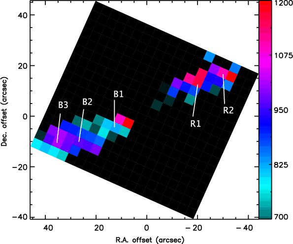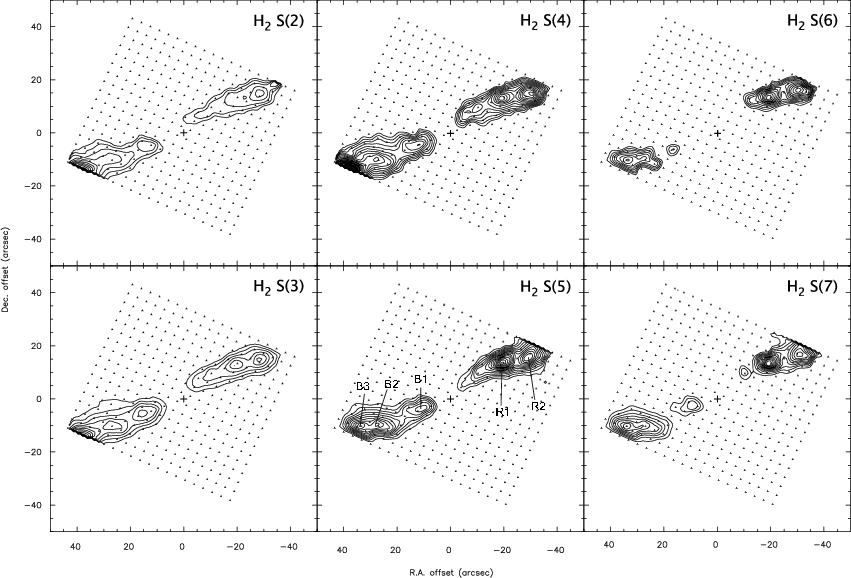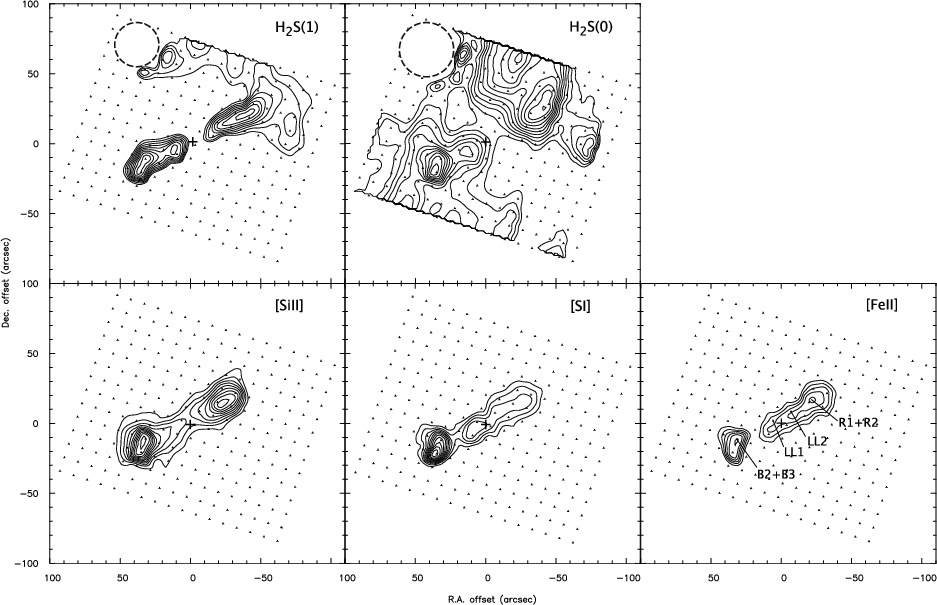 the near-IR line fluxes and morphologies at the apex of the redshifted lobe with a series of bowshocks (O'Connell et al. 2005). A Spitzer map obtained at the tip of the blue lobe indicates a higher excitation 40 km s-1 dissociative shock on that side, with a substantial UV flux (Tappe et al. 2008).