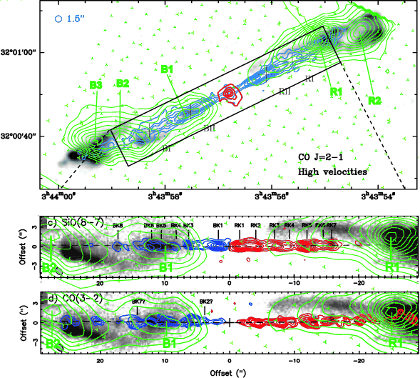 The CO jet is also traced in SiO by means of interferometric observations of the J=1-0 (Chandler & Richer 2001), 5-4 (Hirano et al. 2006), and 8-7 (Lee et al. 2007) transitions, and single-dish multi-transition studies (Gibb et al. 2004; Nisini et al. 2002b). Excitation of these high J levels implies that the SiO jet is warmer and denser than the outflow cavity traced by low-velocity CO emission.